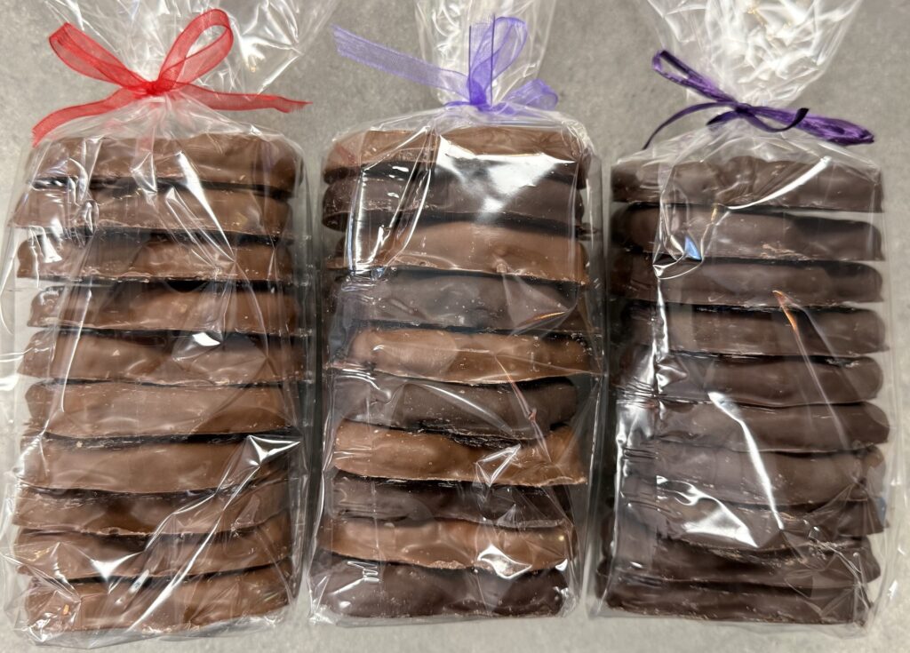 Vanilla Pizzelles drizzled with dark chocolate. $15 pkg (dozen)